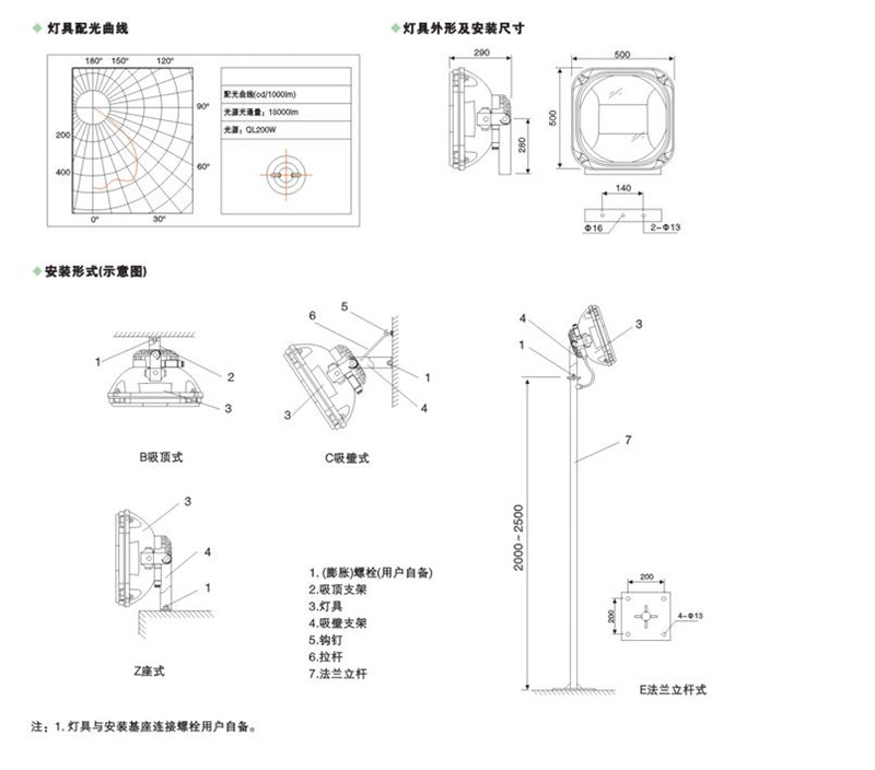 ●本燈具防爆型式為復合型或粉塵防爆型,適用于氣體或粉塵爆炸危險場所照明使用。