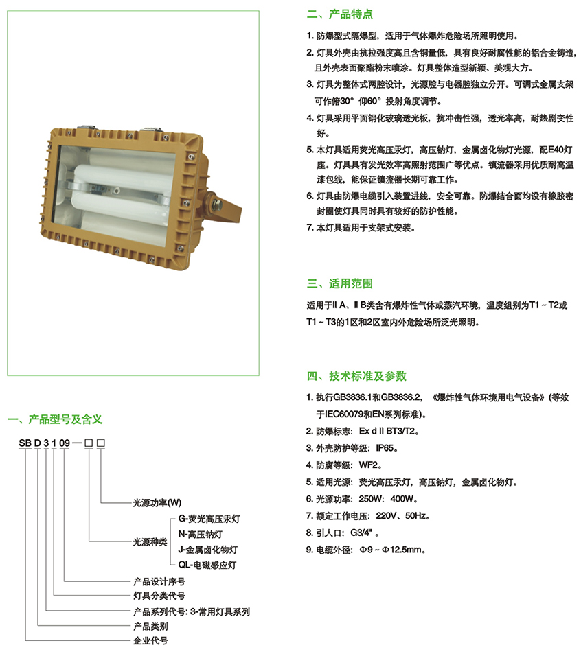 防爆泛光燈同隔爆型燈具相比,具有重量輕、價(jià)格低、安裝維護(hù)方便、使用壽命長(zhǎng)等優(yōu)點(diǎn)