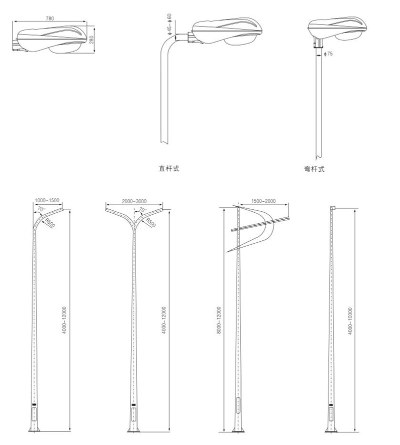 ●柱頂和側(cè)向兩種安裝方式,可適合φ45~φ75mm多種直徑燈桿的配套安裝,并根據(jù)現(xiàn)場照明要求,在-5℃ ~ +5℃范圍內(nèi)調(diào)節(jié)照明角度。